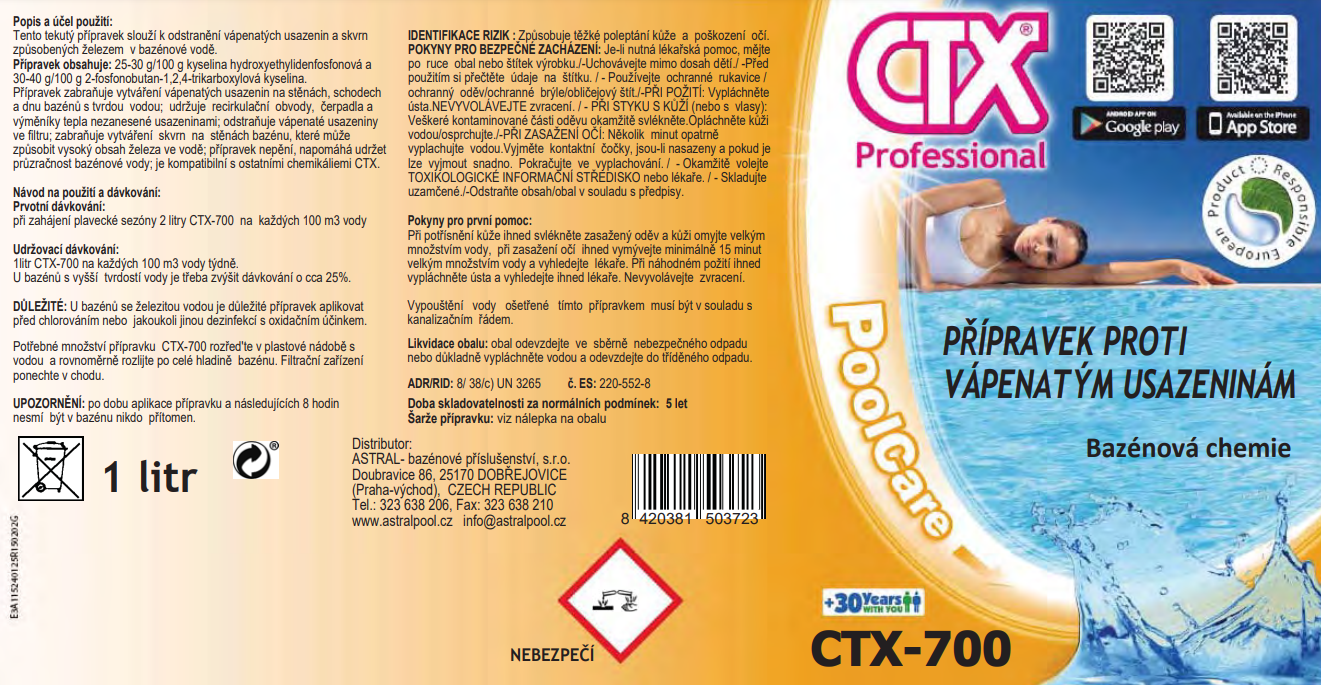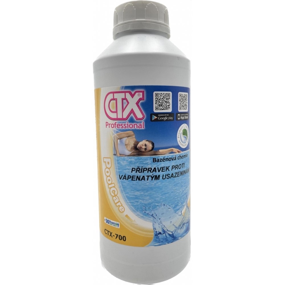 Tekutý přípravek velmi účinně odstraňuje vápenaté usazeniny a skvrny způsobené železem v bazénové vodě, a to přímo do napuštěného bazénu. Přípravek zabraňuje vytváření vápenatých usazenin na stěnách, schodech a dnu bazénu s tvrdou vodou. Udržuje recirkulační obvody, čerpadla a výměníky tepla zanesené usazeninami a odstraňuje vápenaté usazeniny ve filtru. Přípravek nepění, napomáhá udržet průzračnost bazénové vody a je kompatibilní s ostatními přípravky CTX. 1 L